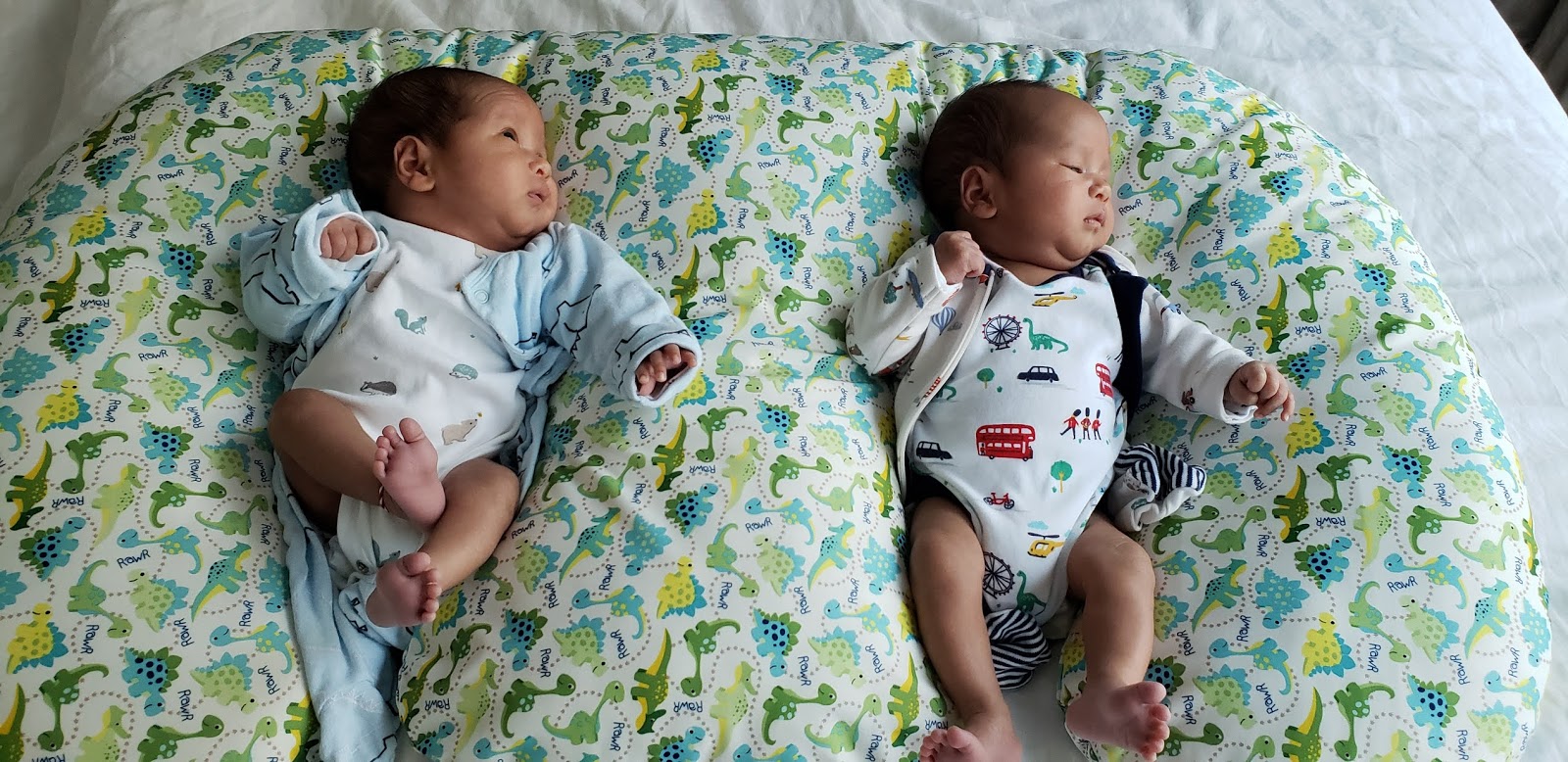 We had a really nice bright sunny day and I took a snap of my little feeding corner - my rocking chair and pillows next to my bed and near a little dresser where I prop my phone/water bottle/pump parts/spit up bibs. I'm so SO glad we bought this chair. I don't know where I would have fed, or how my back would have been able to handle properly feeding these babies, otherwise.
