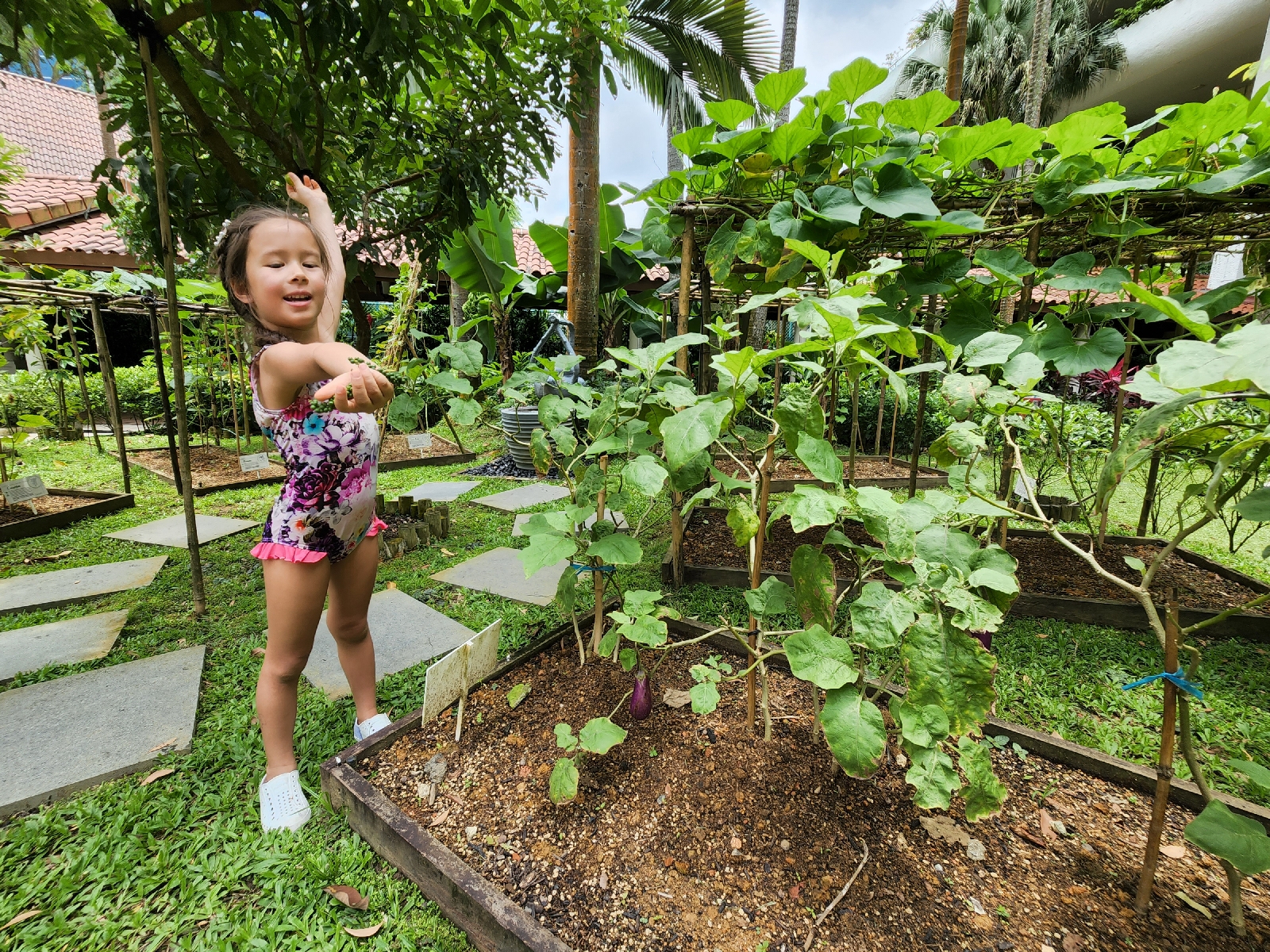 The gardens - I love seeing things grow! They had an astounding array of fruits and vegetables: calamansi, lemons, eggplant, long beans, mint, thyme, pepper, pumpkin, bitter melon, cucumber, okra, bananas, longan, aloe, and that's probably not even half of it.The rooms were great. We got two connecting rooms on the family floor, which comes with special access to a family pantry - with free washer dryers, laundry detergent, dishwashing liquid, microwave, bottle warmers and a whole lotta other stuff - baby potties, strollers, step stools, night lights, lullaby soothers, bath toys...here is a snapshot of the tent bed they set up. Lola loved sleeping in here each night!